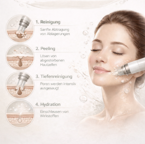 Durch Aqua Peel wird die Haut porentief gereinigt und sanft gepeelt. Als erster Schritt wird ein enzymatisches Peeling durchgeführt, um die Haut vorzubereiten. Danach erfolgt die Aquabrasion, wobei ein Wasser- Fruchtsäure- Gemisch unter Druck auf die Haut gebracht wird und sofort wieder abgesaugt wird. Damit wird eine Tiefenreinigung erreicht, die Unreinheiten und Ablagerungen zuverlässig entfernt.